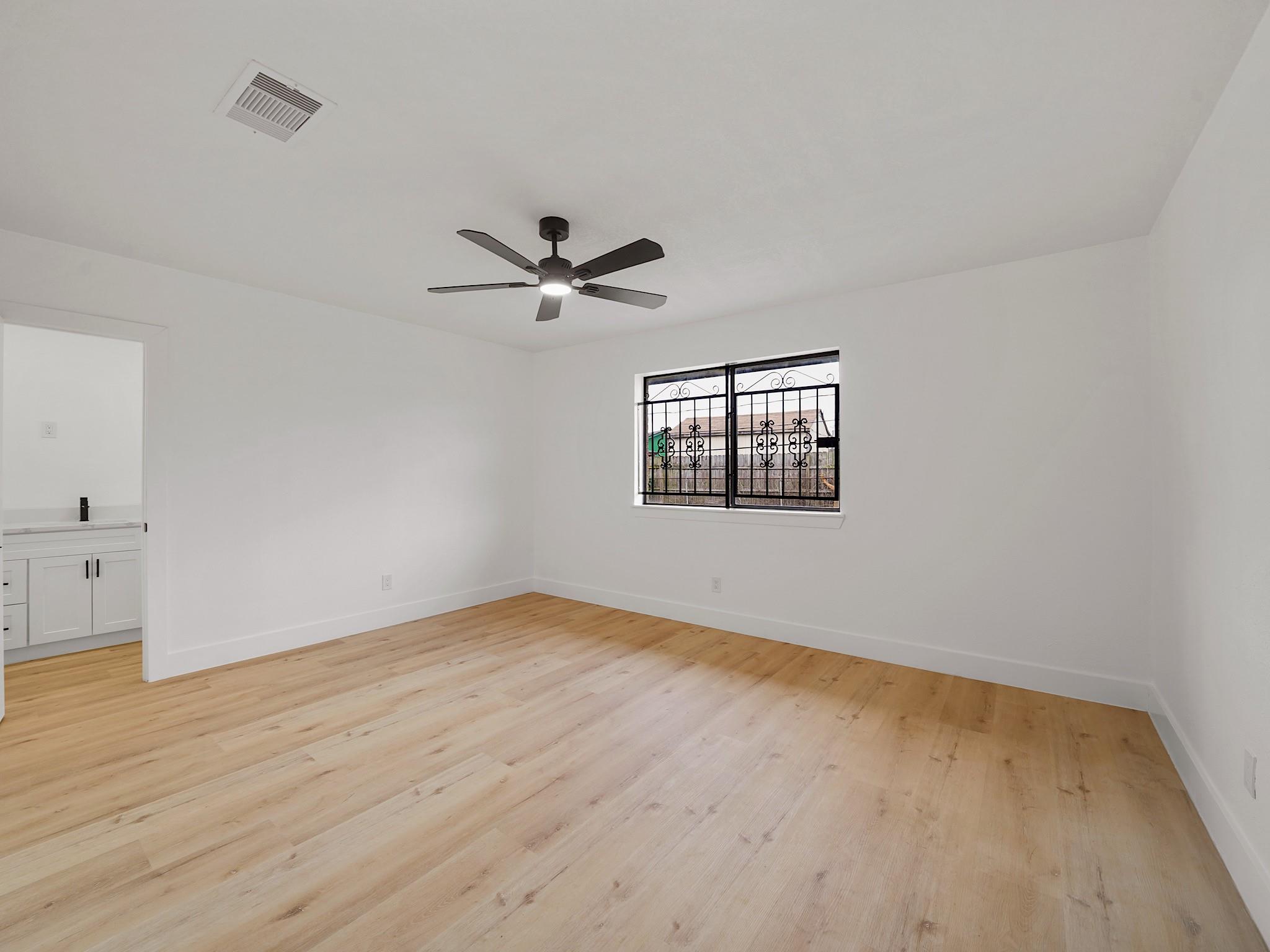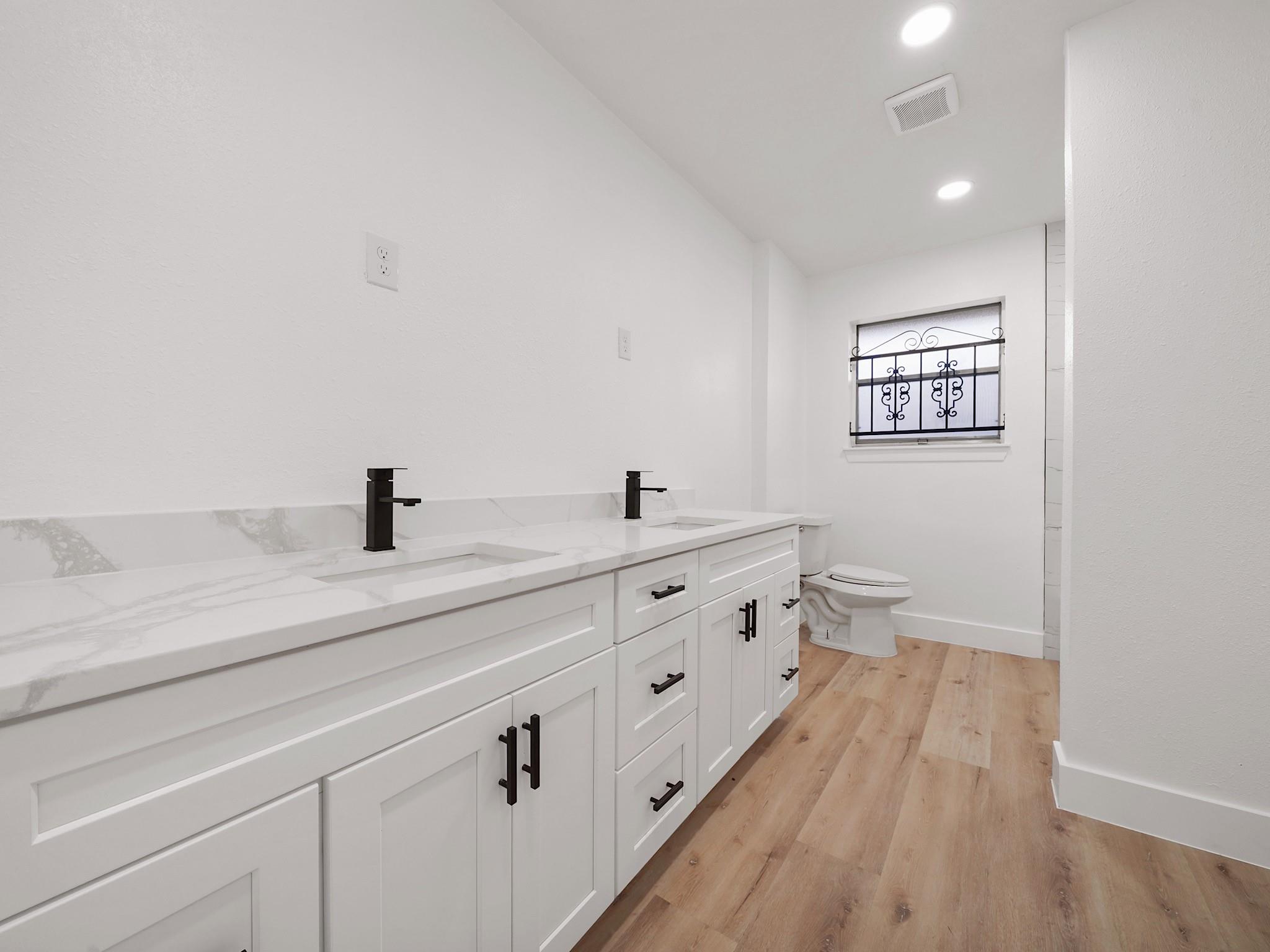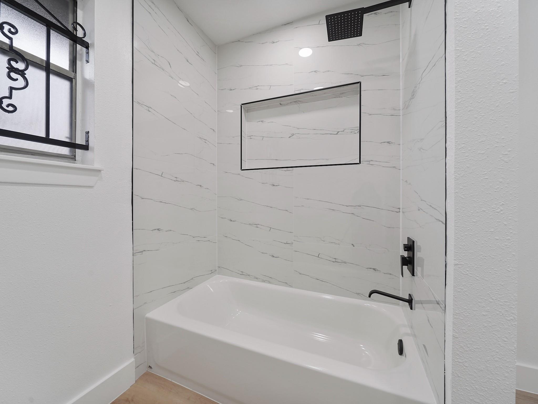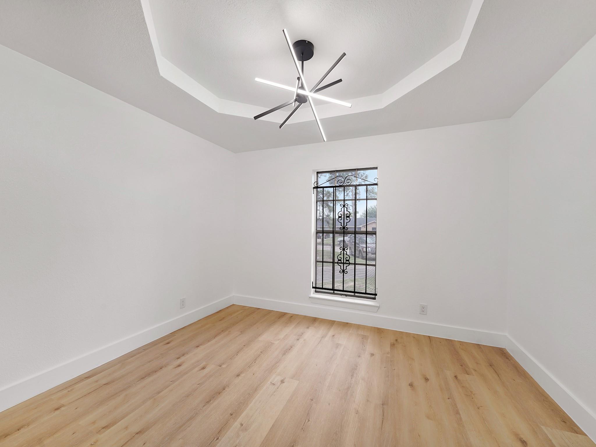 Completely remodeled 4-bedroom, 2-bath home at 9811 Degas Ln, Houston, TX! This move-in-ready property features an open layout with wood-look flooring, recessed lighting, fresh paint, and modern black fixtures throughout. The updated kitchen offers white shaker cabinets, quartz countertops, marble-look backsplash, and sleek appliances. Both bathrooms have been beautifully renovated with contemporary finishes, including a dual-sink vanity and glass-enclosed shower in the primary suite. Spacious secondary bedrooms provide flexibility for guests or a home office. Enjoy a large backyard, two-car garage, and classic brick exterior with fresh accents. Conveniently located near major roads, shopping, and dining. A must-see!