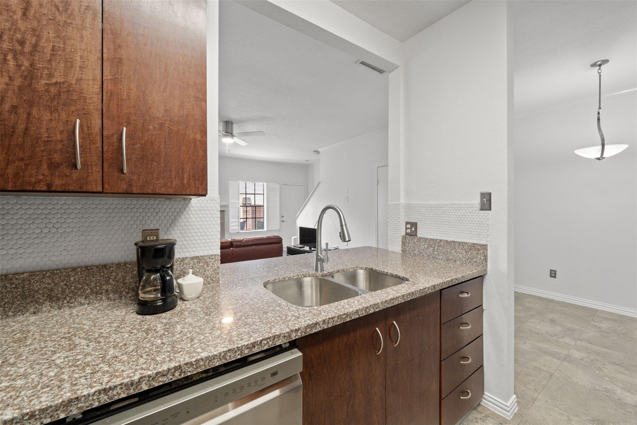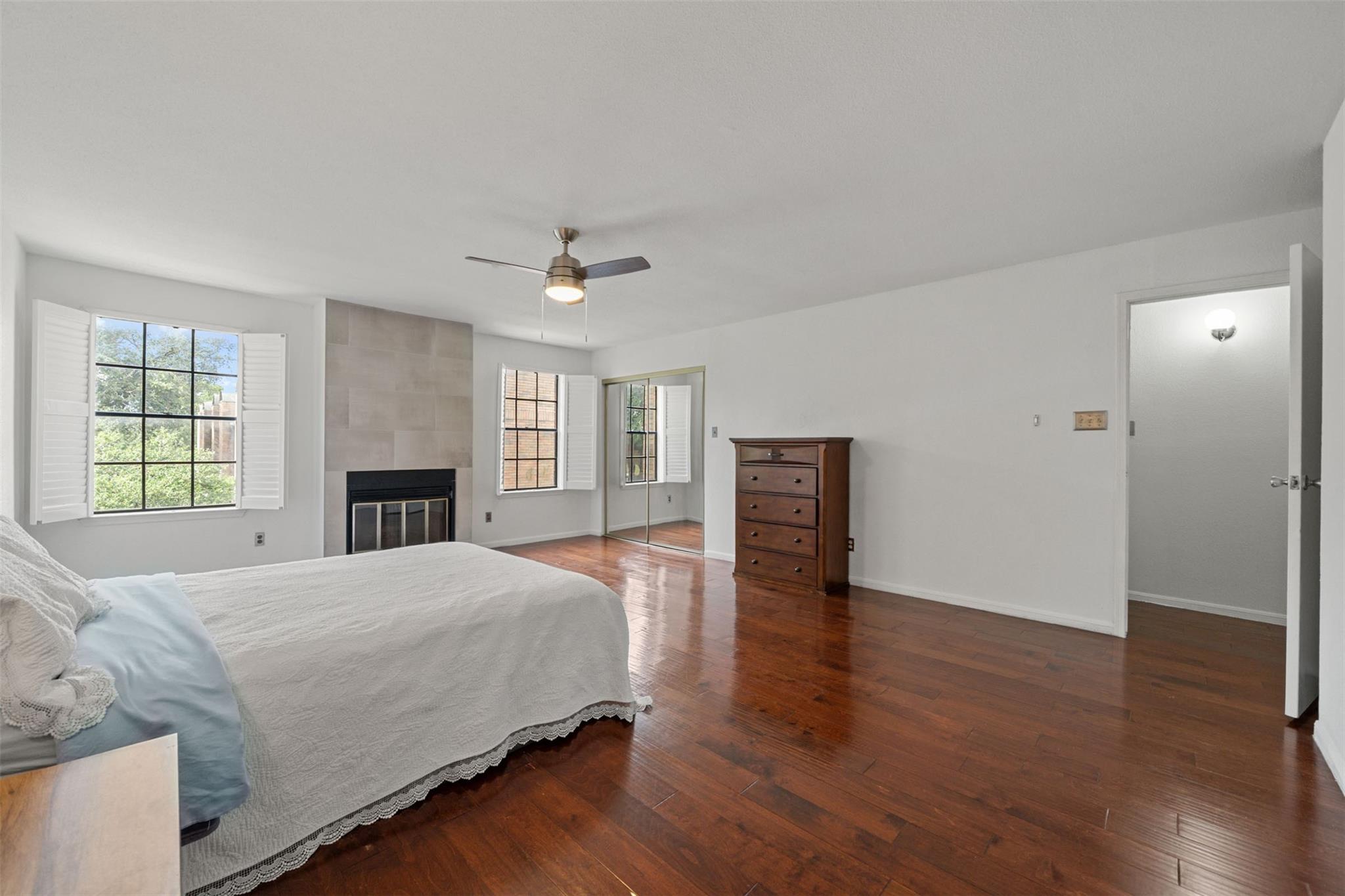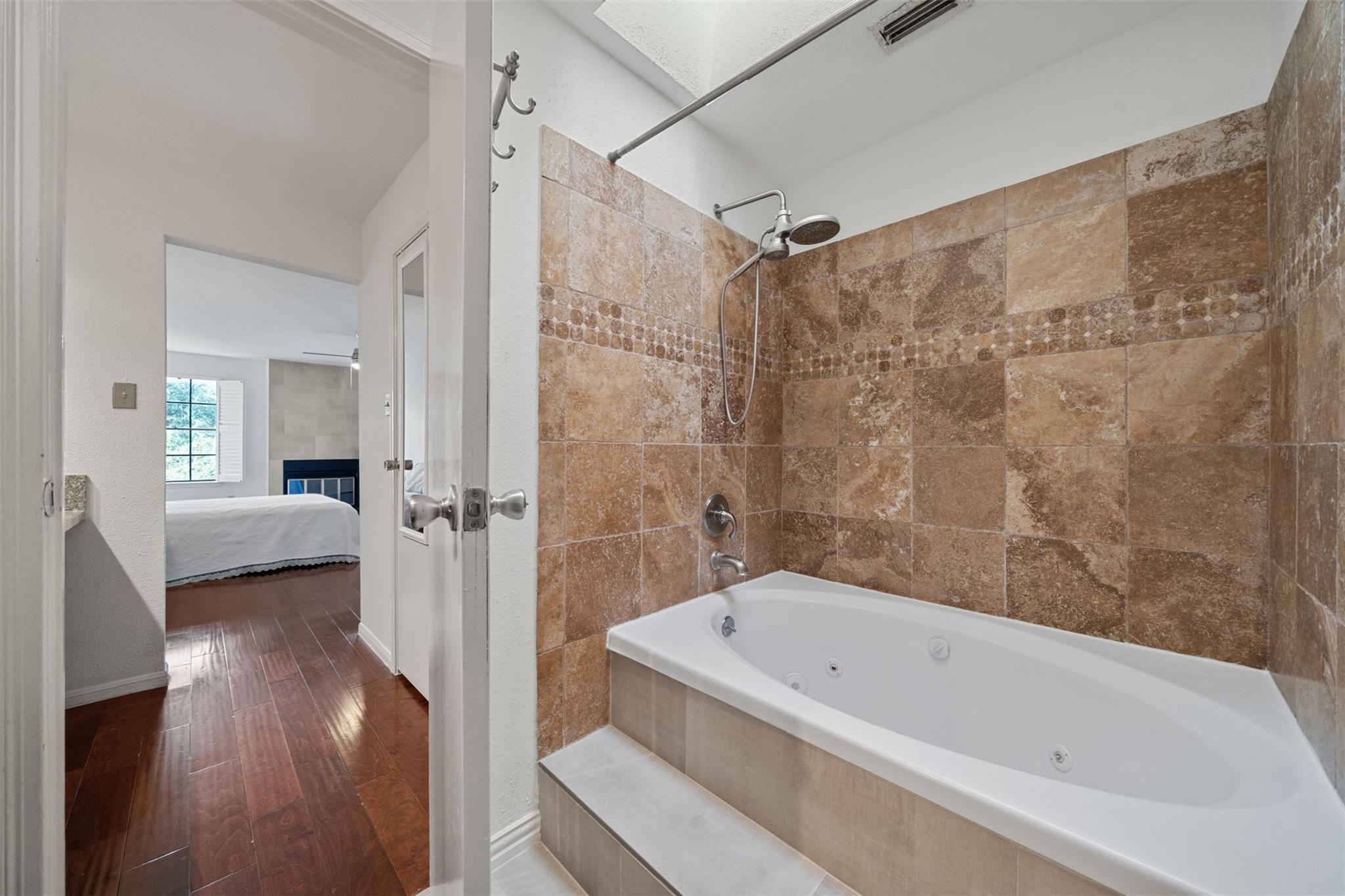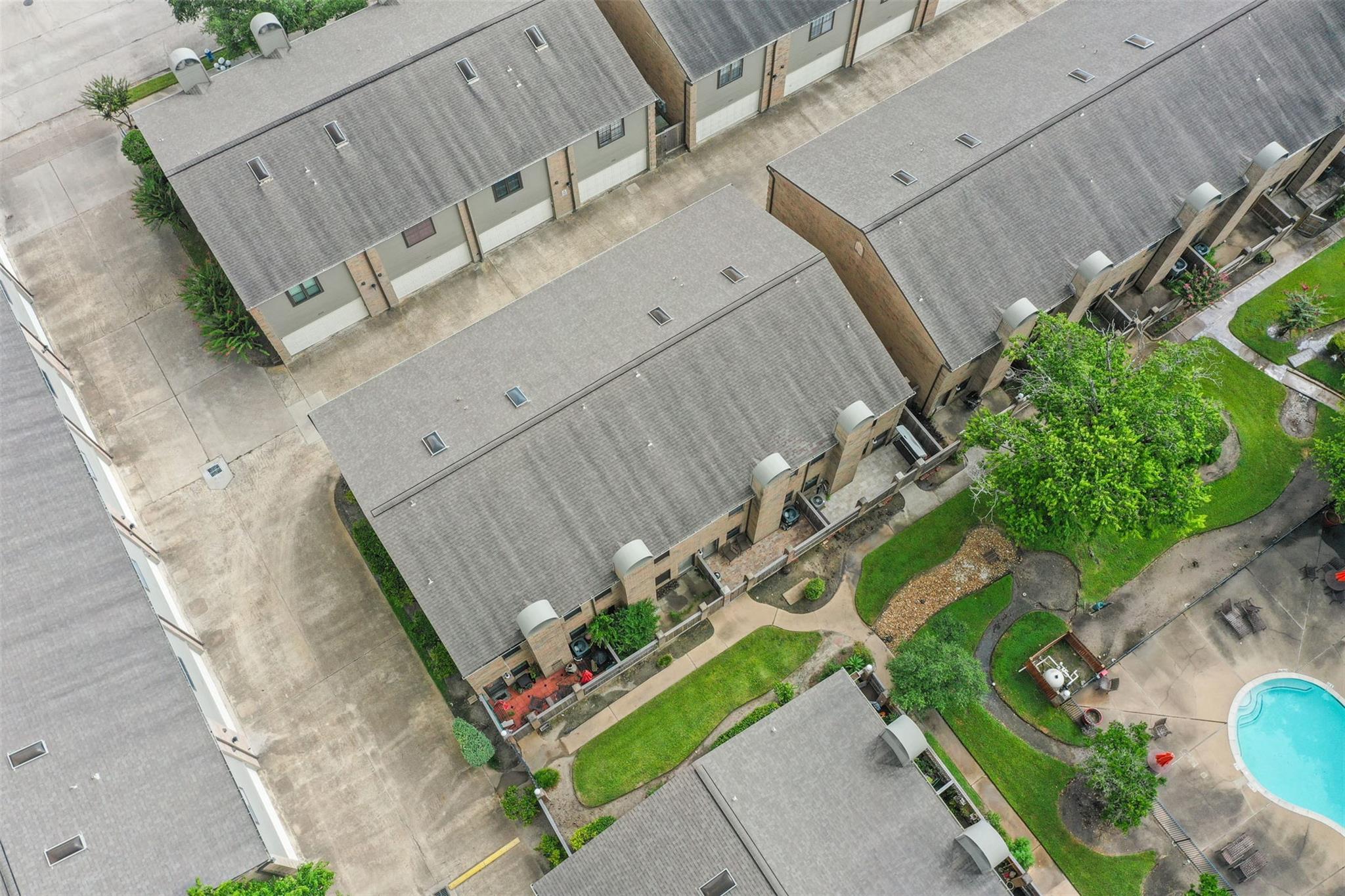 Beautifully Updated 2-Story Condo with Pool Views! This stylish townhouse offers serene pool views, a private fenced front yard, and an attached 2-car garage. Inside, the home features neutral finishes, granite countertops throughout, and wood-look flooring in every room for a clean, cohesive look. The first floor includes a welcoming living room with a cozy fireplace, a dining area, a dry bar, and a well-appointed kitchen with stainless steel appliances, a breakfast bar, and abundant cabinet space. Upstairs, you’ll find two spacious bedrooms—each with its own en-suite bathroom. The primary suite stands out with a second fireplace, dual vanities, and a relaxing jetted tub. The community offers two pools, and the HOA covers water, sewer, and trash. Plus, you’ll enjoy quick access to Westpark Tollway, Beltway 8, Chinatown, Memorial City/CityCentre, The Galleria, and more. Sneed Spark Park is conveniently located right across the street. Move-in ready and perfectly located!