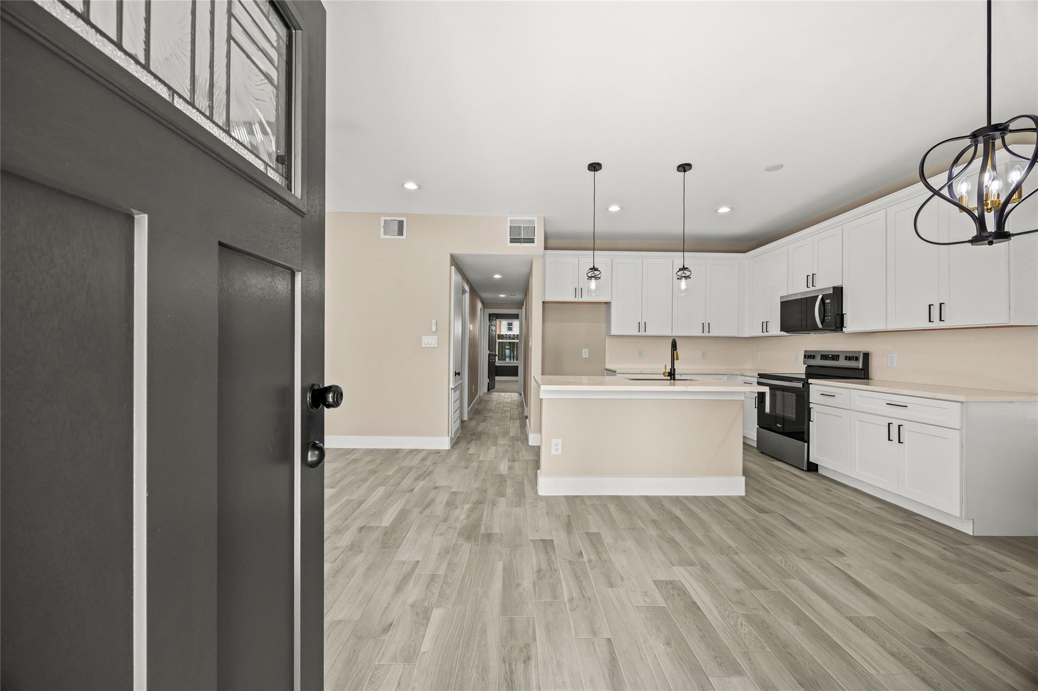 Completed this year, this modern duplex offers two beautifully finished 3-bedroom, 2-bath units, each with open-concept living, sleek white cabinetry, stainless steel appliances, subway tile backsplash, and light flooring. Spacious bedrooms include plush carpet, double-door closets, and ceiling fans, while contemporary bathrooms feature elegant tile work and black fixtures. Each unit has private entrances. With central electric cooling, in-unit laundry connections, and a corner lot setting, this income-producing property is ideal for investors seeking a turnkey opportunity near major Houston employment hubs.